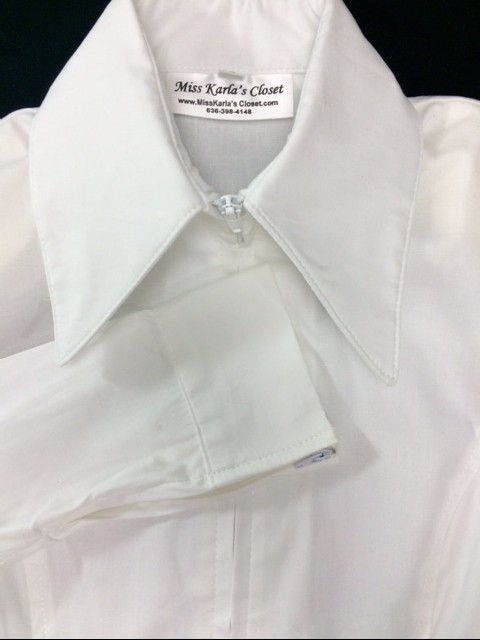 Stretch poly/cotton White fitted show shirt. This shirt has a hidden zipper in the front and zippers in the sleeves. Wear it with our coordinating vests and/or scarves or wear it tucked in as a no bling horsemanship top. Shirt has princess seams and shoulder pads for a great fit.